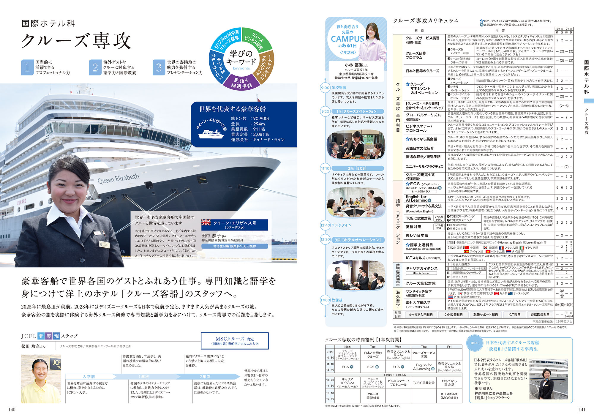 「国際的に活躍できるプロフェッショナル力」「海外ゲストやクルーに対応する語学力と国際教養」「世界の寄港地の魅力を発信するプレゼンテーション力」を押さえた特別なカリキュラム、先輩たちの体験談など充実した学習内容をご紹介します。