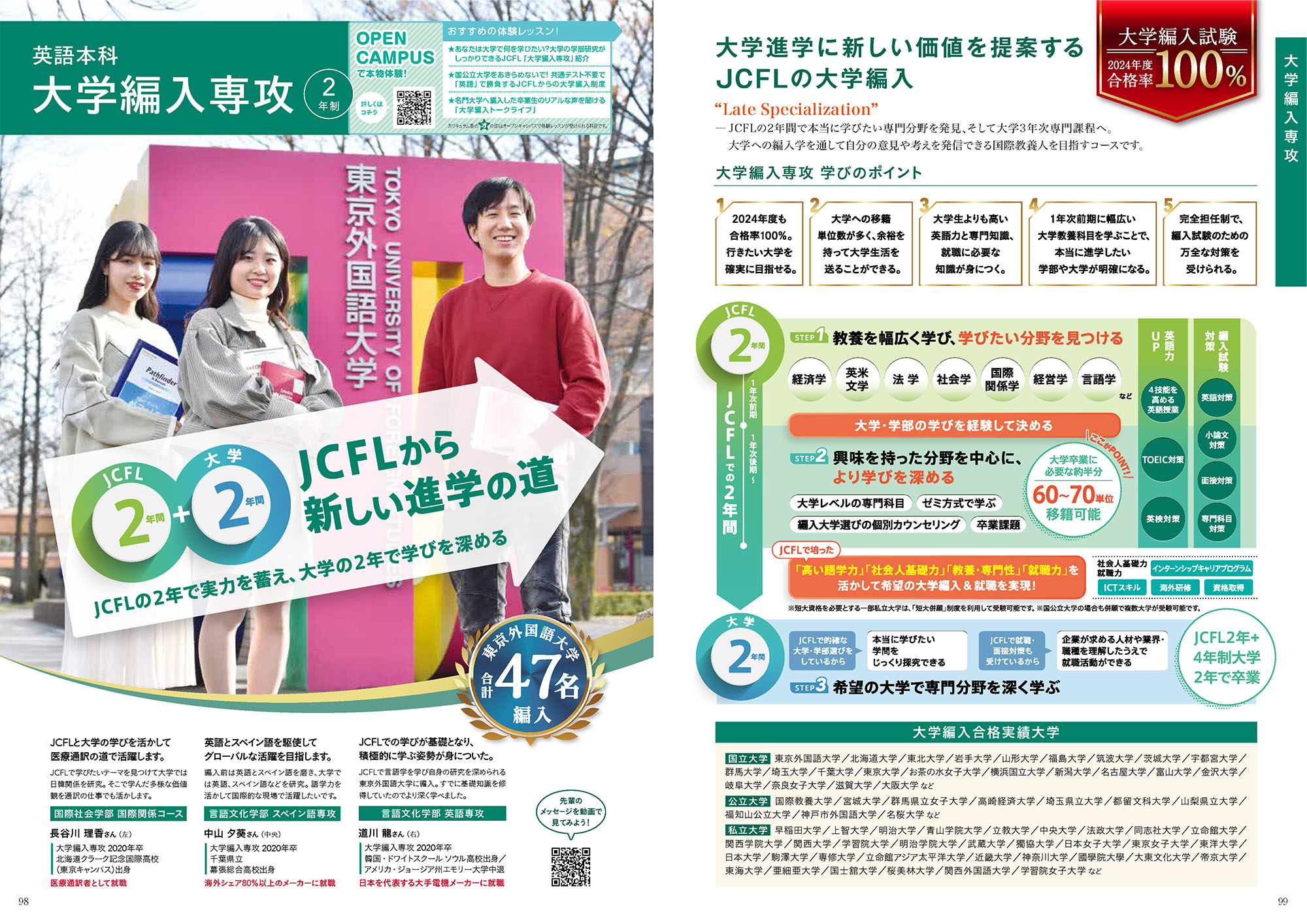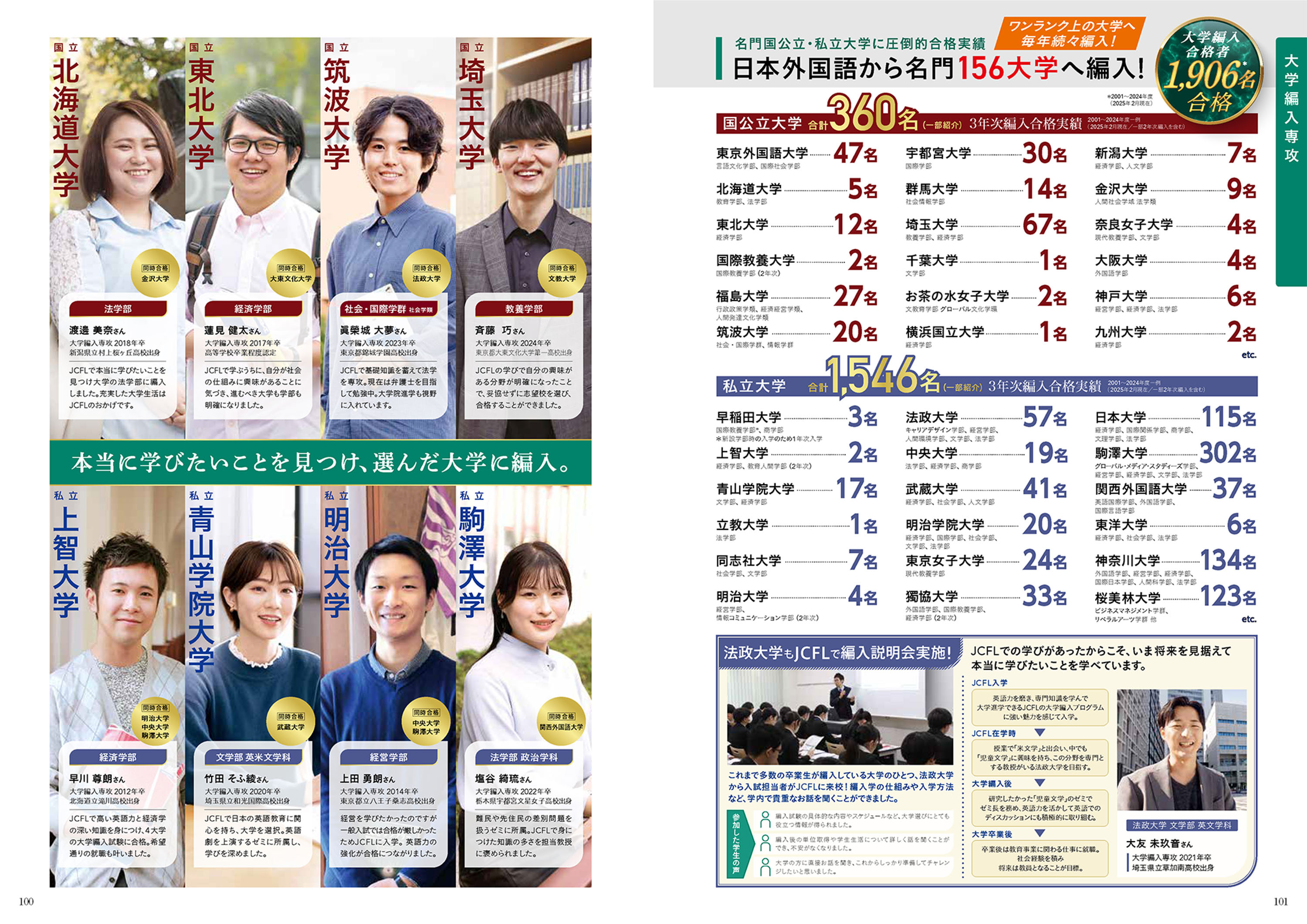 法律は犯罪者を制裁するためだけではなく社会復帰の手助けをするためにもあることから、法に携わる仕事をしたいと思い大学でさらに法学を学ぼうと考えました。JCFLに入学した理由は、英語はもちろん法学も専門の先生に学べ法学部編入を目指せるから。大学の編入試験は英語が重要でしたが、授業の予習・復習だけで入学時のTOEICスコアを370点から一気に730点まであげることができました。北海道大学では専門の法律科目を中心に、政治系の科目や臨床心理学も履修。将来、法科大学院へ進み司法試験を目指すために、「単位のための勉強」ではなく「身になる勉強」をしています。