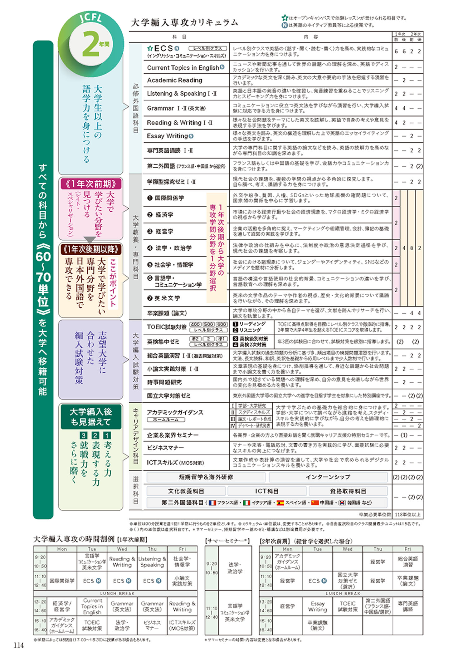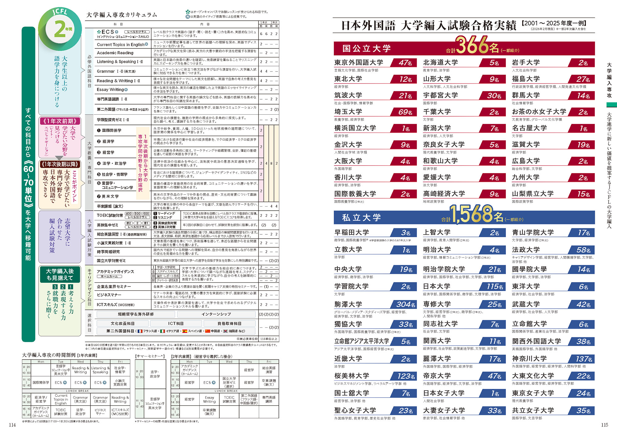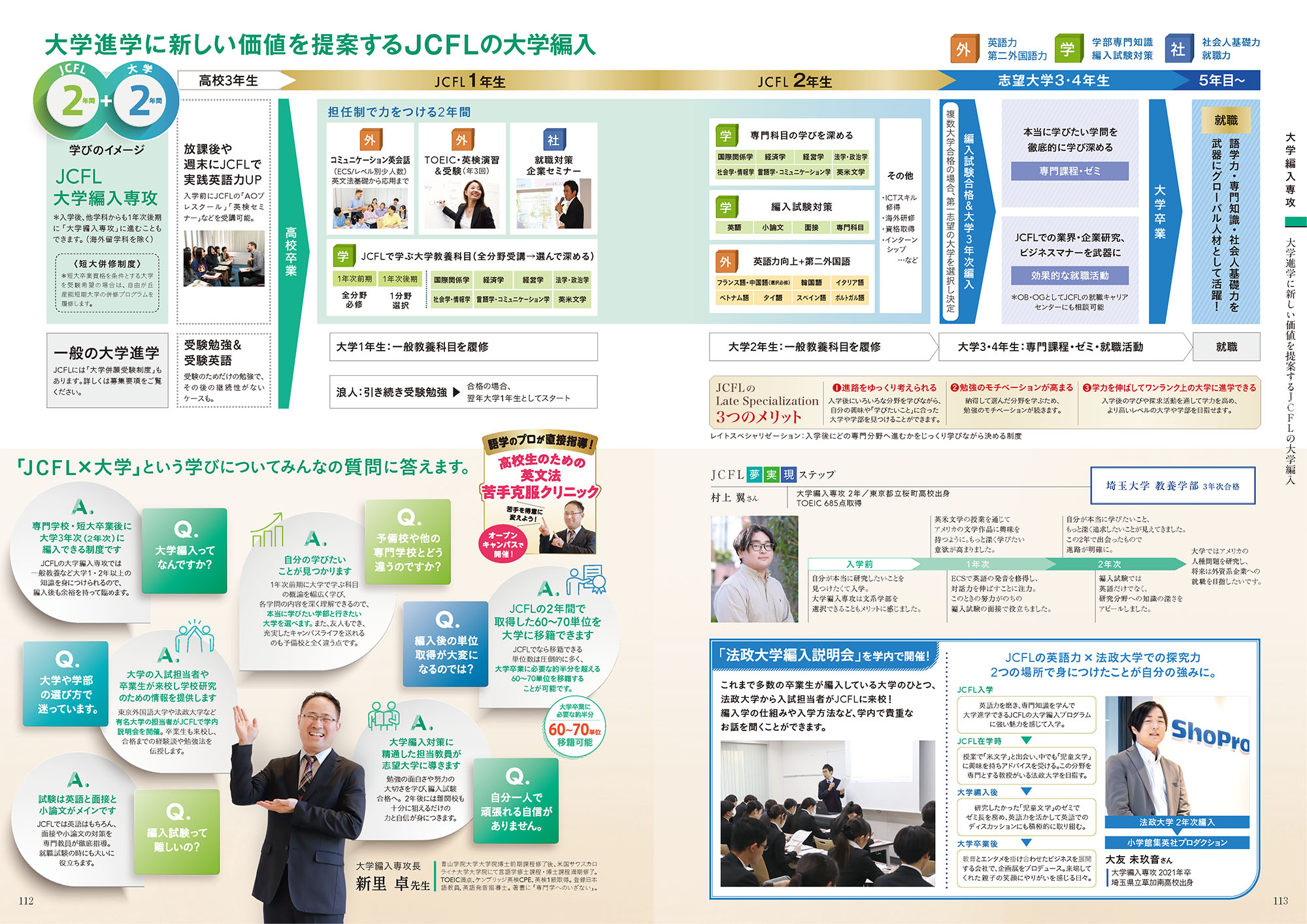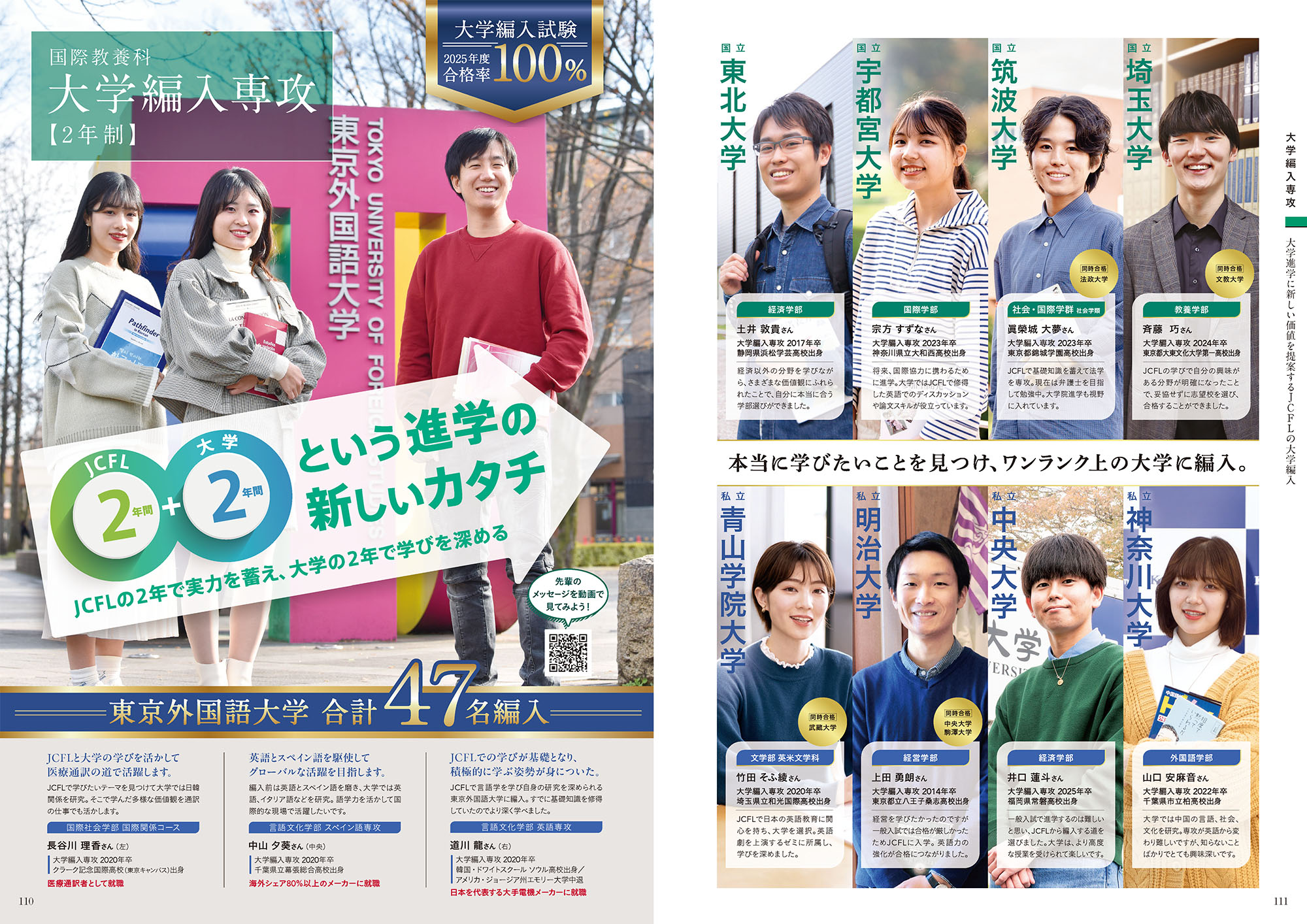 大学進学に新しい価値を提案する、JCFLの大学編入JCFLの2年間で本当に学びたい専門分野を発見、そして大学3年次専門課程へ。大学への編入学を通して自分の意見や考えを発信できる国際教養人を目指すコースです。 JCFLから新しい進学の道2年間で実力を蓄え、大学の2年で学びを深める大学進学に新しい価値を提案するJCFLの大学編入大学編入の実績、カリキュラムなど学科紹介動画/ダイジェスト版学科紹介動画/フルバージョンJCFLから目指せる大学・学部(一部紹介)国公立大学