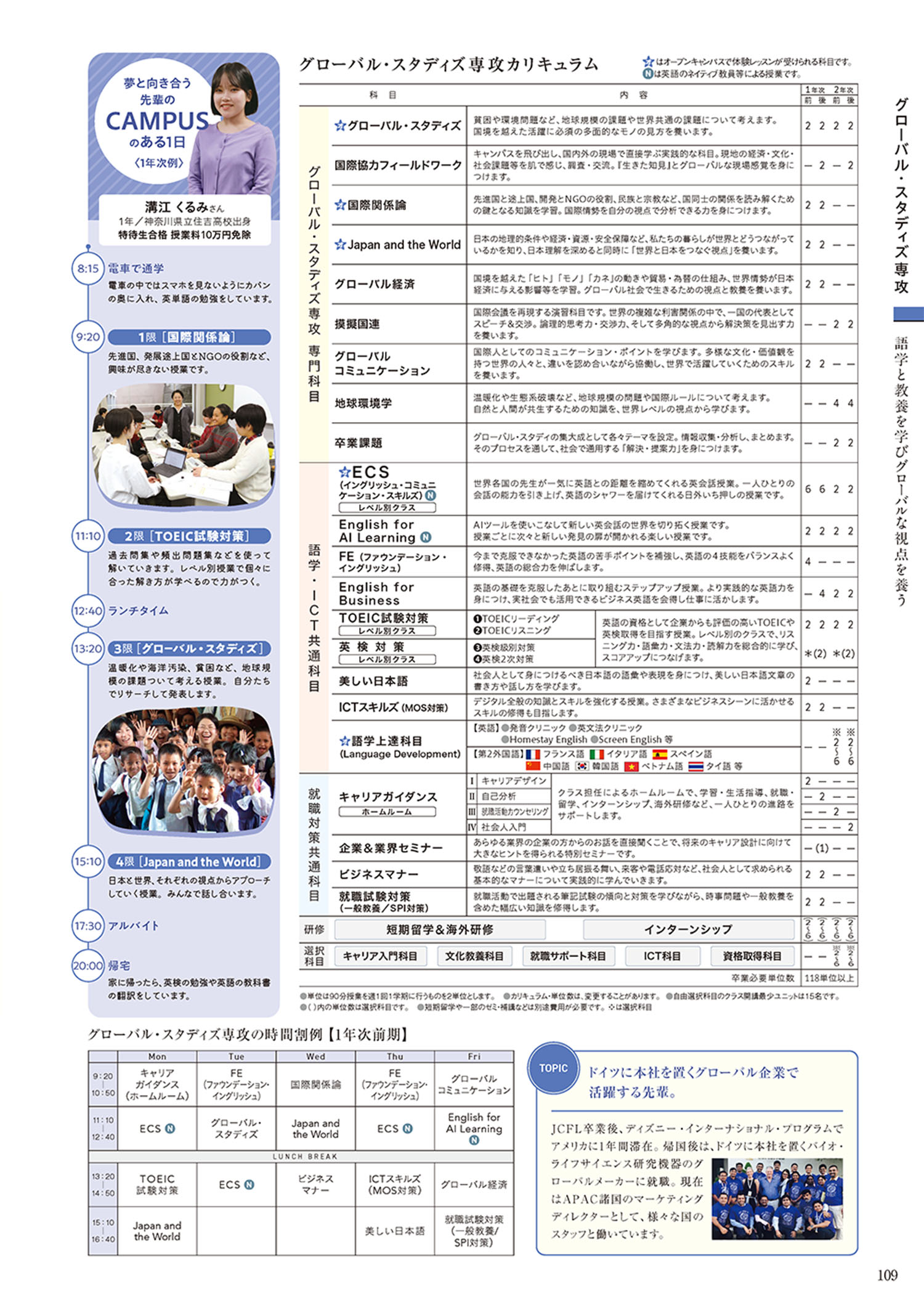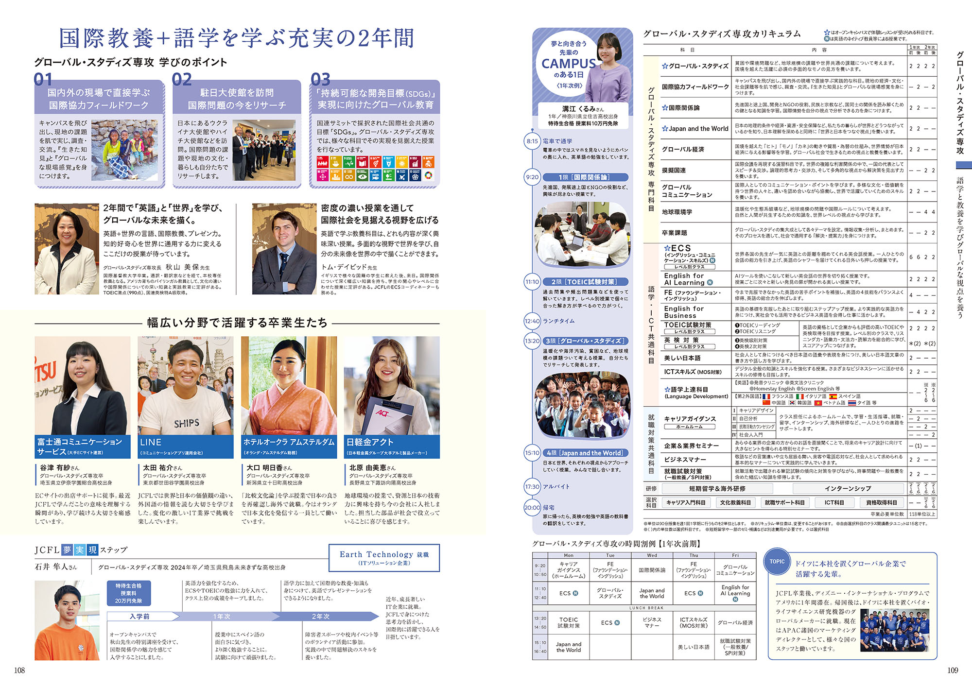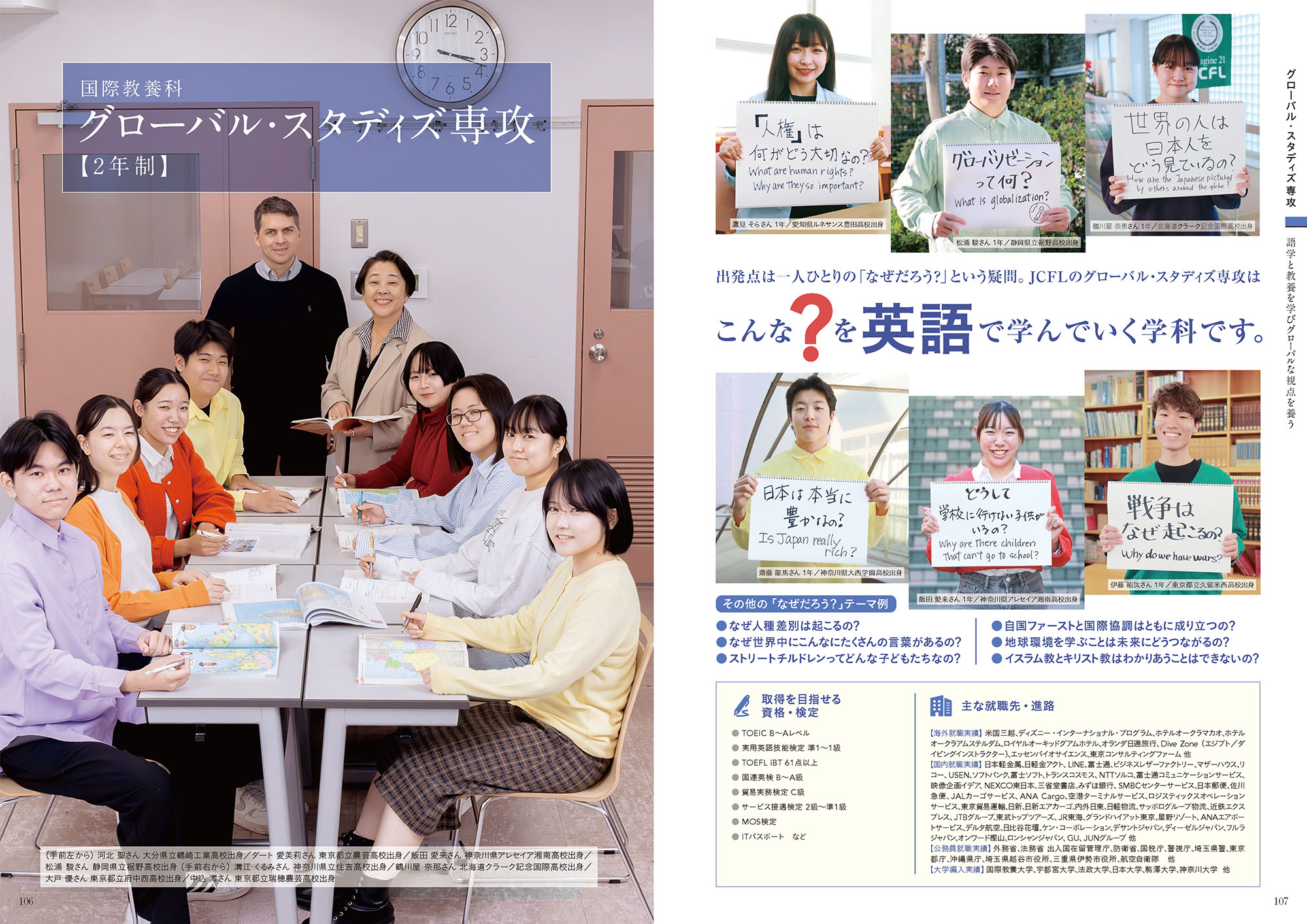 語学と教養を学びグローバルな視点を養うJCFLのグローバル・スタディズ専攻は「なぜ人種差別は起こるの?」「なぜ世界中にこんなにたくさんの言葉があるの?」「ストリートチルドレンってどんな子どもたちなの?」「自国ファーストと国際協調はともに成り立つの?」「地球環境を学ぶことは未来にどうつながるの?」「イスラム教とキリスト教はわかりあうことはできないの?」このような疑問を英語で学んでいく学科です。 グローバル・スタディズ専攻 学びのポイント出発点は一人ひとりの「なぜだろう?」という疑問国際教養+語学を学ぶ充実の2年間取得を目指せる