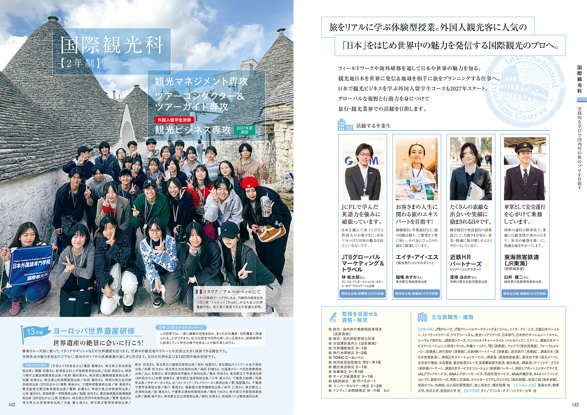 JTBグループ、JTBグローバルマーケティング&トラベル、エイチ・アイ・エス、近畿日本ツーリスト、ユナイテッドツアーズ、クラブツーリズム、東武トップツアーズ、日本旅行、日本旅行オーエムシートラベル、ユーラシア旅行社、JR東海ツアーズ、モンベルネイチャートラベル(ベルカディア)、エアトリ、JR東日本サービスクリエーション、小田急トラベル、沖縄ツーリスト、TEI(添乗員)、マンデラ(海外添乗員)、フォーラムジャパン(添乗員)、旅行綜研(添乗員)、近鉄HRパートナーズ(添乗員)、読売旅行(添乗員)、JR東日本(東日本旅客鉄道)、JR東日本ステーションサービス、JR東海(東海旅客鉄道)、東京地下鉄(東京メトロ)、京浜急行電鉄、京成電鉄、東武鉄道グループ、首都圏新都市鉄道、福井鉄道、JR東海リテイリング・プラス(新幹線パーサー)、JR東日本サービスクリエーション(新幹線パーサー)、羽田エアポートエンタープライズ、JALグランドサービス、ANAエアポートサービス、羽田空港サービス、ANA沖縄空港、NAAリテイリング、はとバス、郵船クルーズ、商船三井客船、ホテルオークラアムステルダム(海外就職)、米国三越(海外就職)、帝国ホテル、外務省、出入国在留管理庁、海上保安庁、横浜税関 他