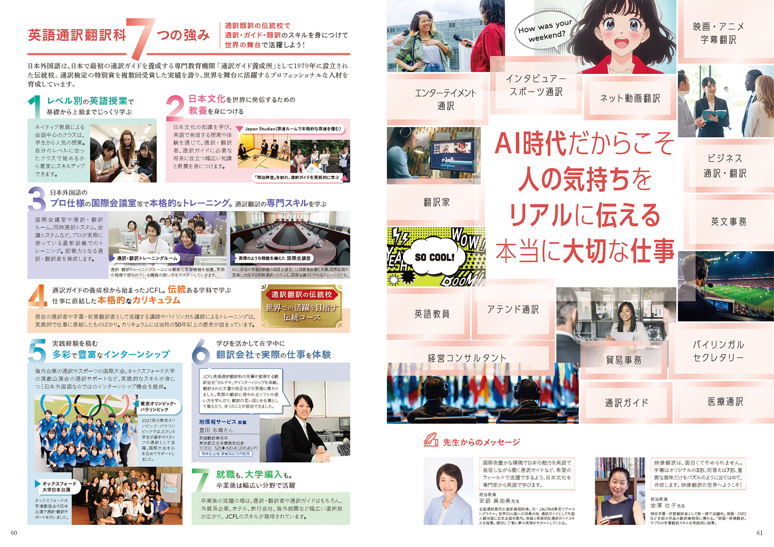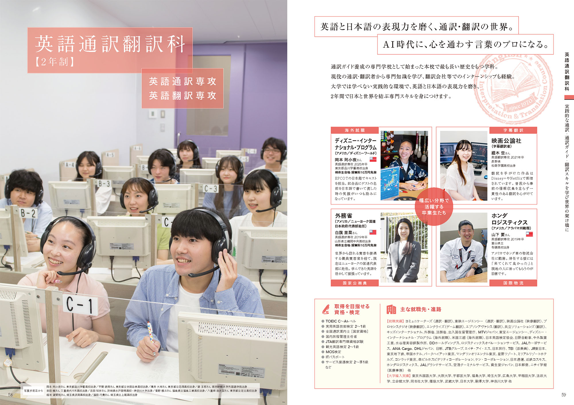 コミュニケーターズ(通訳・翻訳)、東映エージエンシー(通訳・翻訳)、映画公論社(映像翻訳)、プロセンスタジオ(映像翻訳)、エンタライズ(ゲーム翻訳)、エプソンアヴァシス(翻訳)、共立ソリューションズ(翻訳)、キッズインターナショナル、外務省、法務省、出入国在留管理庁、MTVジャパン、東宝エージェンシー、ディズニー・インターナショナル・プログラム(海外就職)、米国三越(海外就職)、日本英語検定協会、日野自動車、中外製薬工業、水谷理美容鋏製作所、DDホールディングス、ロジスティックスオペレーションサービス、JALカーゴサービス、ANA Cargo、DHLジャパン、 日新、JTBグループ、エイチ・アイ・エス、日本旅行、TEI(添乗員)、JR東日本、東京地下鉄、帝国ホテル、パークハイアット東京、マンダリンオリエンタル東京、星野リゾート、ミリアルリゾートホテルズ、コンラッド東京、森ビルホスピタリティコーポレーション、ケン・コーポレーション、日本通運、近鉄コスモス、ホンダロジスティクス、JALグランドサービス、空港ターミナルサービス、資生堂ジャパン、日本郵便、ニチイ学館(医療事務) 他
