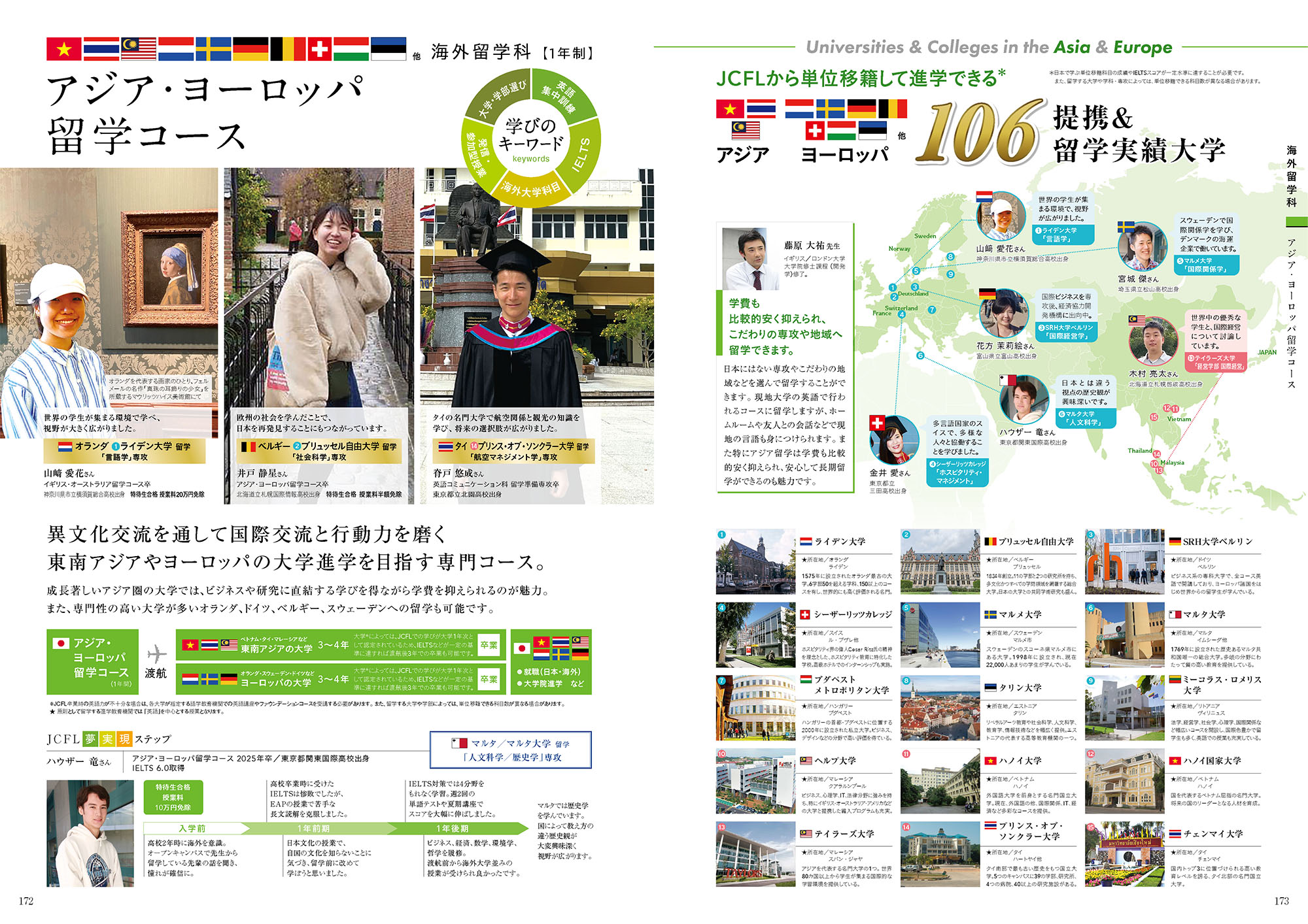 アジア、ヨーロッパ他106もの提携・留学実績、在校生が夢を実現したステップをご紹介します。